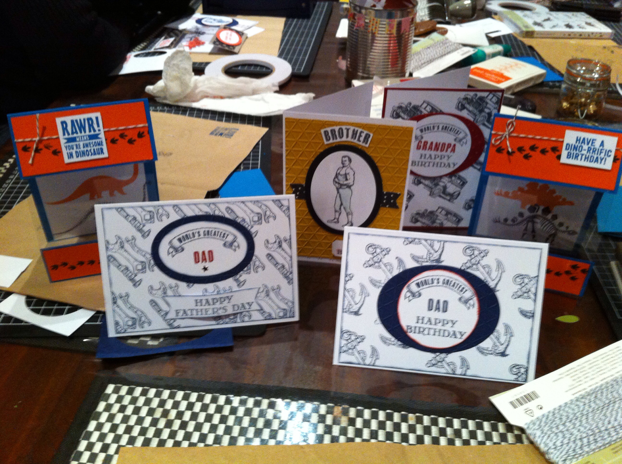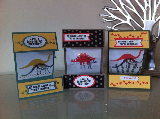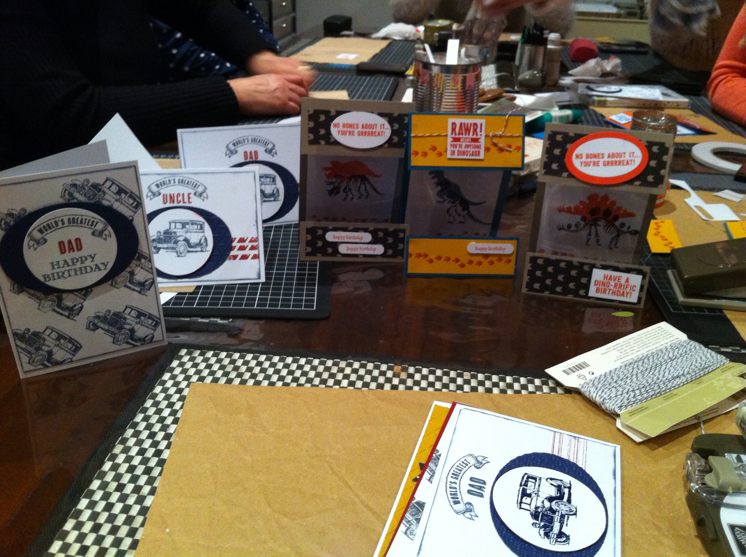 The Ladies enjoyed stamp club this month. They got to play with the No Bones about it Dinosaur stamp set and Guy Greetings stamp set. I love how versatile The Guy Greetings set it with all the Guy words…. Dad, Uncle, Granpa, Brother, Husband and Father…. There’s also Happy Bithday, Happy Fathers Day and Congratulations and Worlds Greatest that can be paired with your non Guy Cards.