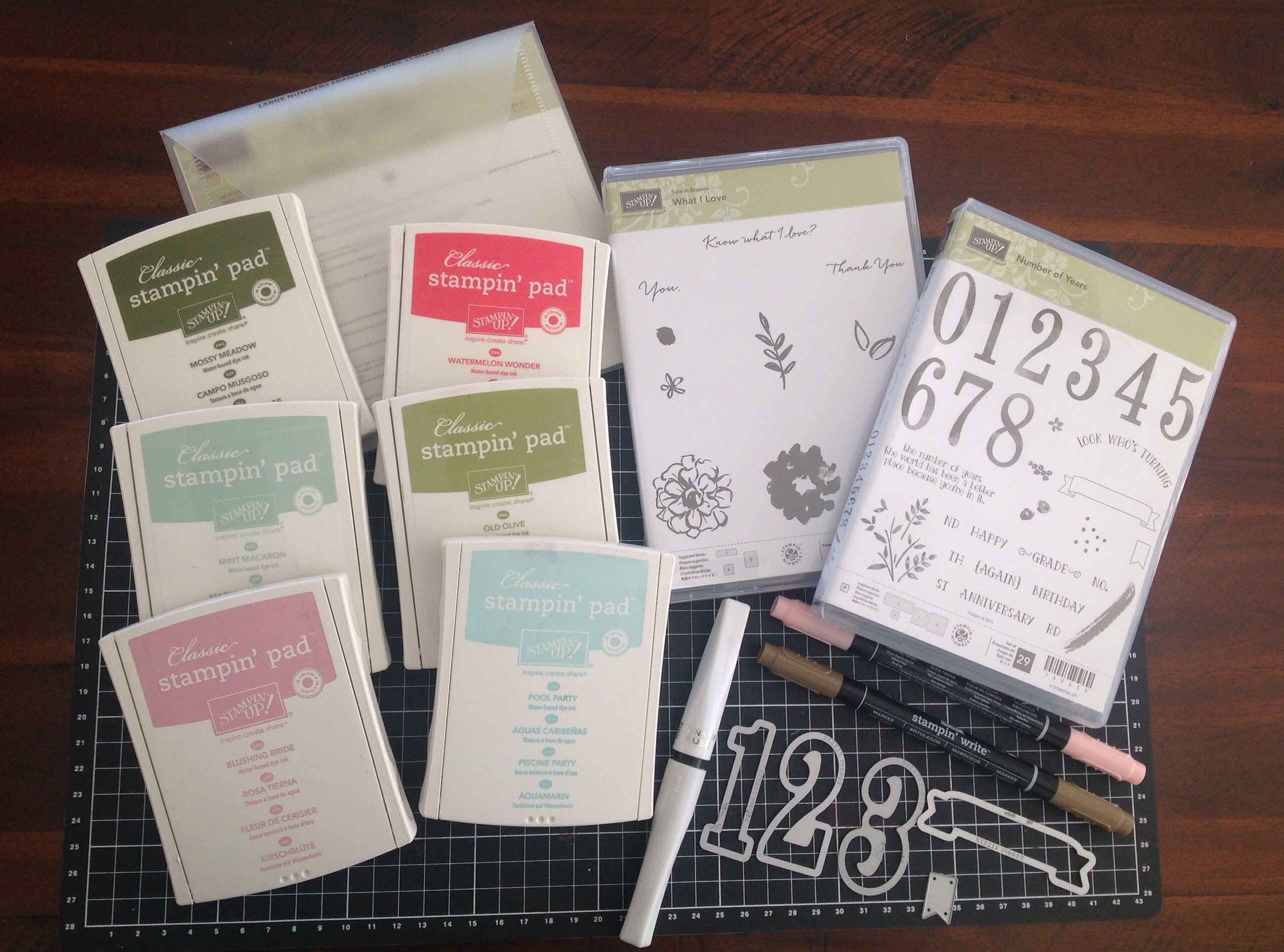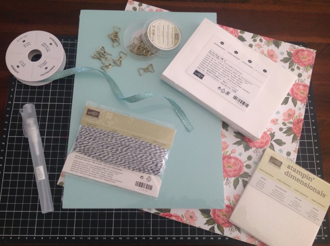 Price includes all material to make up to 16 cards, Birthday Boutique Dsp 6 sheets-6×3 (1 each double sided design), Birthday Bouquet Cardstock (2 of each Colour) Whisper White Cardstck, 1 Stampin Sritzer, 1 ink refil, Bow Paper Clips Embellishments, Pool Party Glitter Ribbon, Basic Black Bakers Twine and envelopes for your cards.